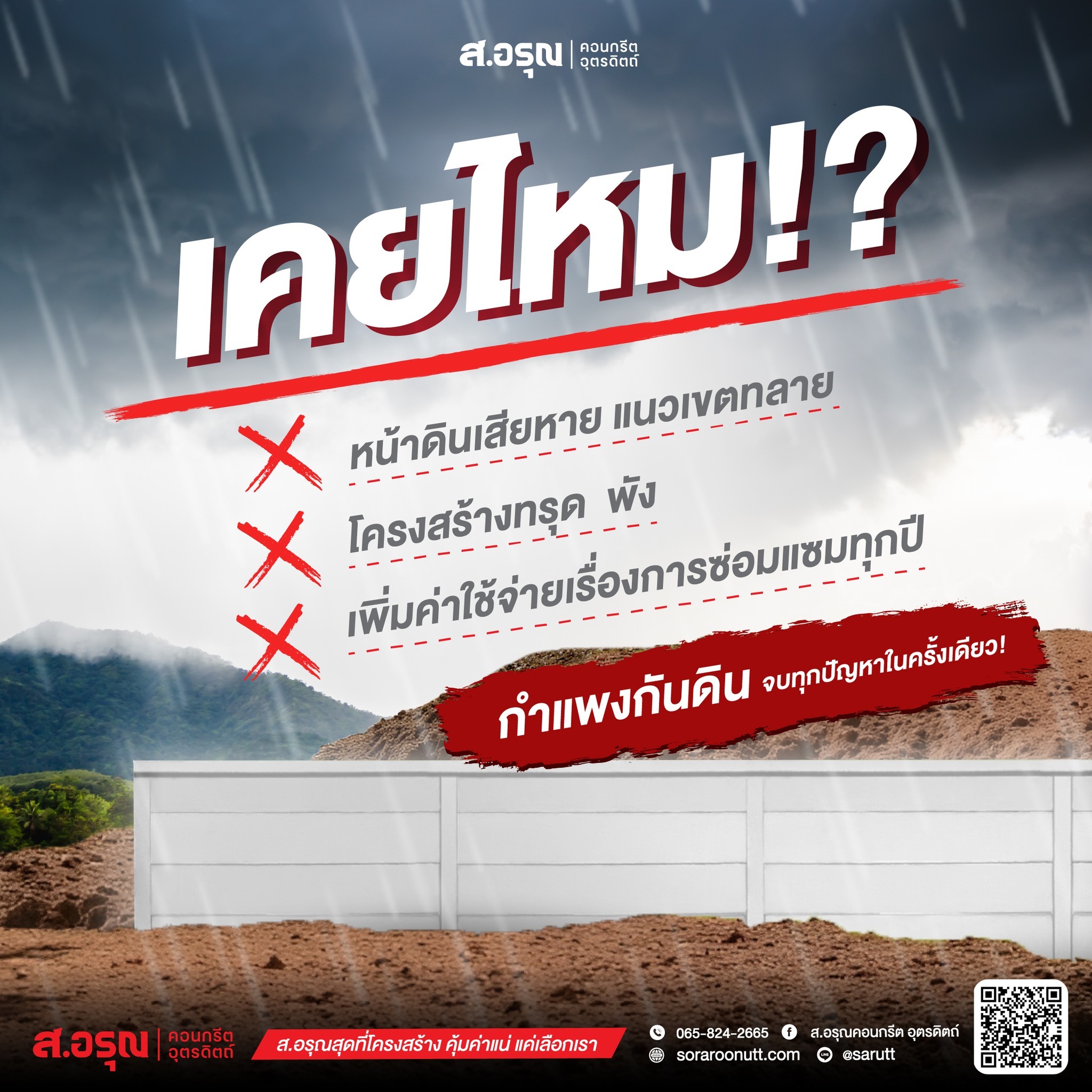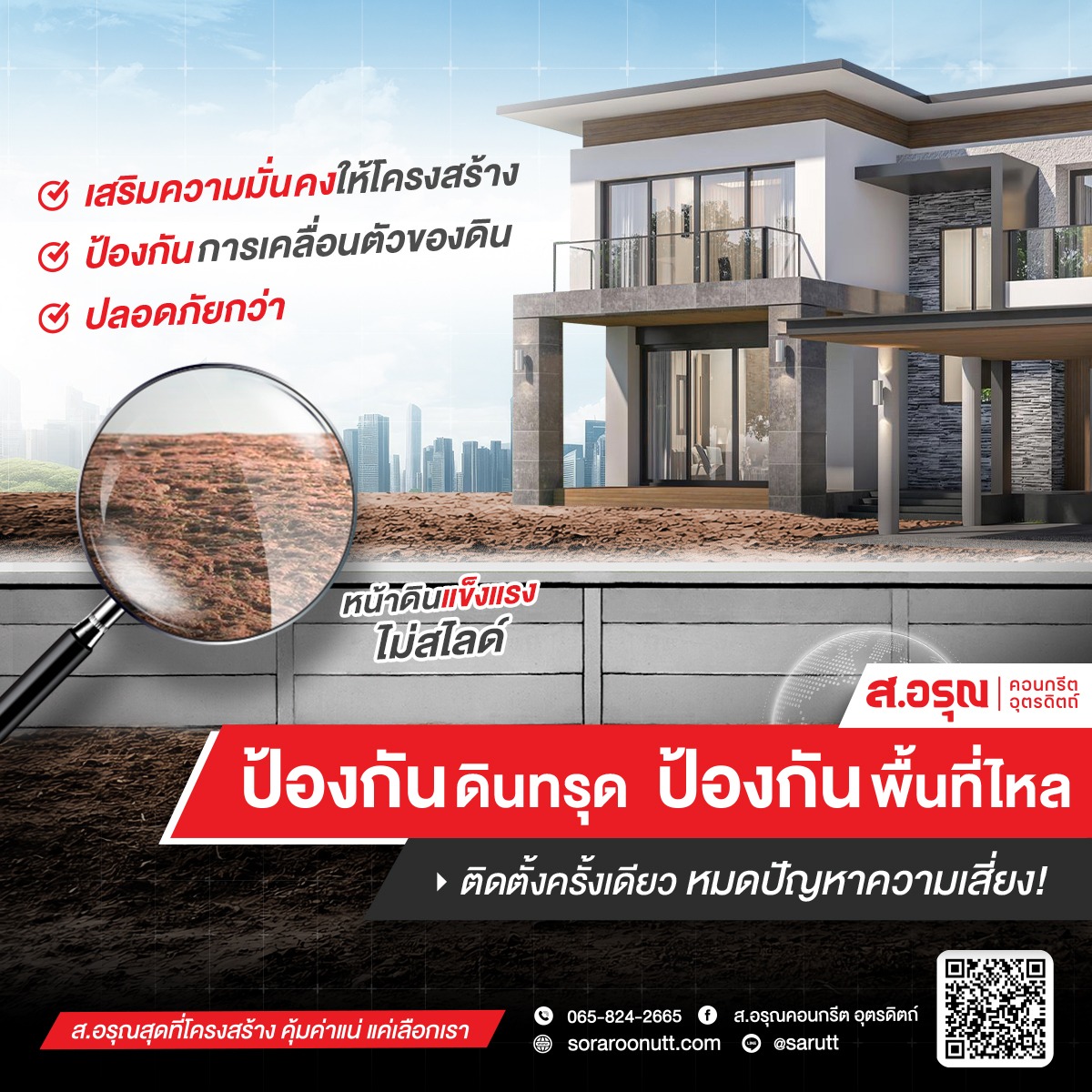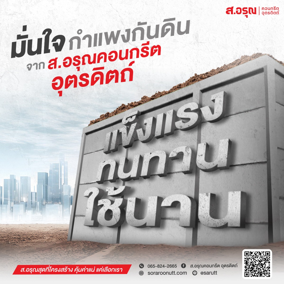 กำแพงกันดิน ป้องกันดินไหล ดินทลาย แบบจบครั้งเดียว! ฝนตกทีไร ดินไหล ดินทรุด กำแพงเอียงจนต้องซ่อมทุกปี?ปัญหาเหล่านี้ “ไม่ใช่เรื่องเล็ก” เพราะส่งผลต่อทั้งโครงสร้างและความปลอดภัยของบ้านคุณ! กำแพงกันดินจาก ส.อรุณคอนกรีต อุตรดิตถ์ “ตัวช่วยที่ผู้รับเหมา–วิศวกรไว้วางใจ” แข็งแรง มาตรฐาน และติดตั้งง่าย✔ ลดปัญหาดินไหล–ดินทลายในระยะยาวช่วยพยุงดินไม่ให้เคลื่อนตัว ทำให้พื้นที่คงสภาพแข็งแรง✔ ป้องกันการเสียหายของแนวเขตที่ดินเหมาะกับพื้นที่ลาดชัน ริมถนน ริมคลอง พื้นที่หลังบ้าน หรือโครงการหมู่บ้าน✔ รับแรงดันดินและน้ำได้ดีเยี่ยมออกแบบตามหลักวิศวกรรม ใช้วัสดุคอนกรีตคุณภาพสูง มาตรฐาน มอก.✔ แข็งแรงทนทาน ติดตั้งไวช่วยให้ผู้รับเหมาทำงานเร็วขึ้น ลดต้นทุน ลดความเสี่ยงเรื่องความปลอดภัย อย่ารอให้ปัญหาใหญ่ก่อน! ป้องกันตั้งแต่วันนี้ด้วย กำแพงกันดินจาก ส.อรุณคอนกรีต อุตรดิตถ์ ปลอดภัย คุ้มค่า ใช้งานได้ยาวนาน สอบถามรายละเอียดสินค้า โทรสอบถาม แอด LINE