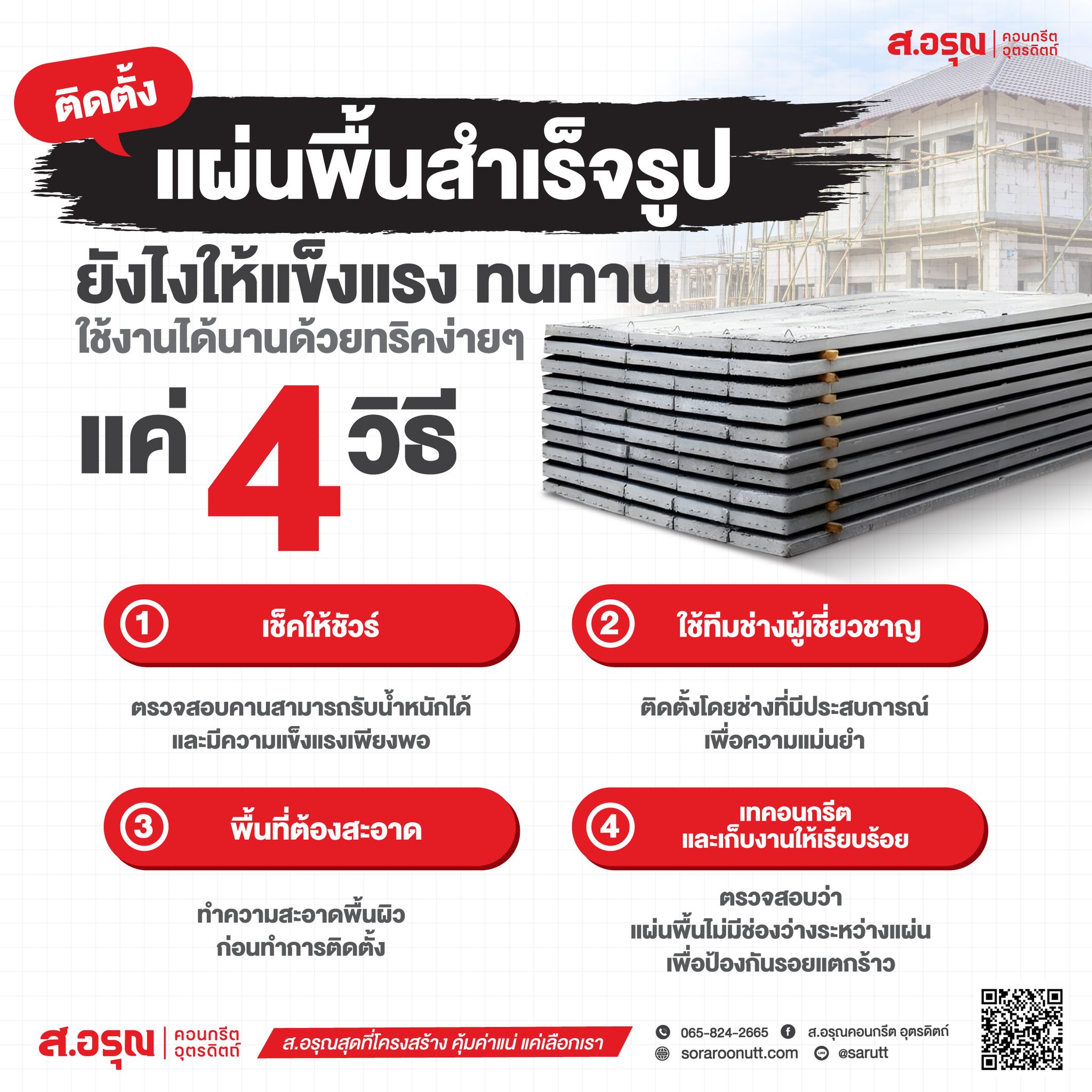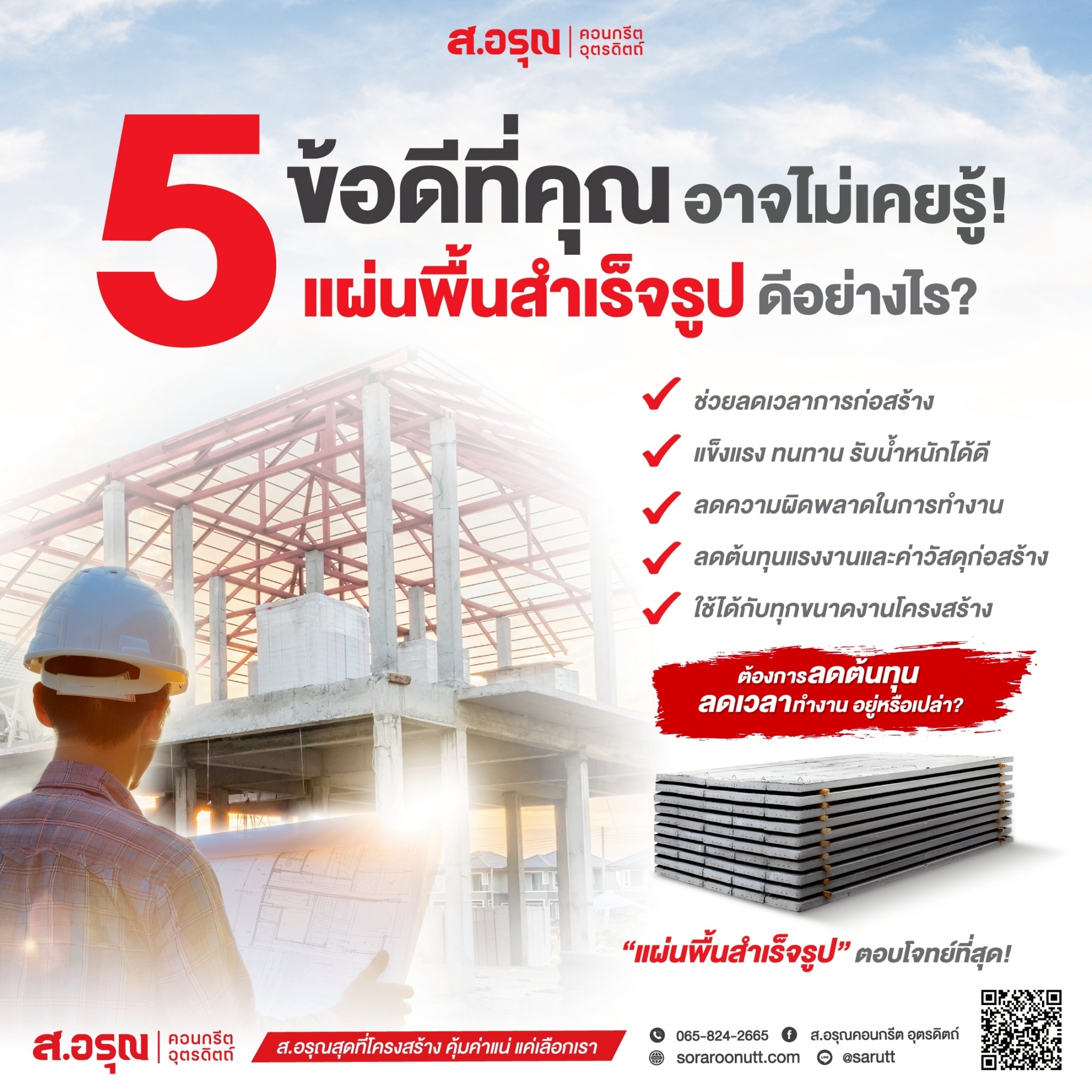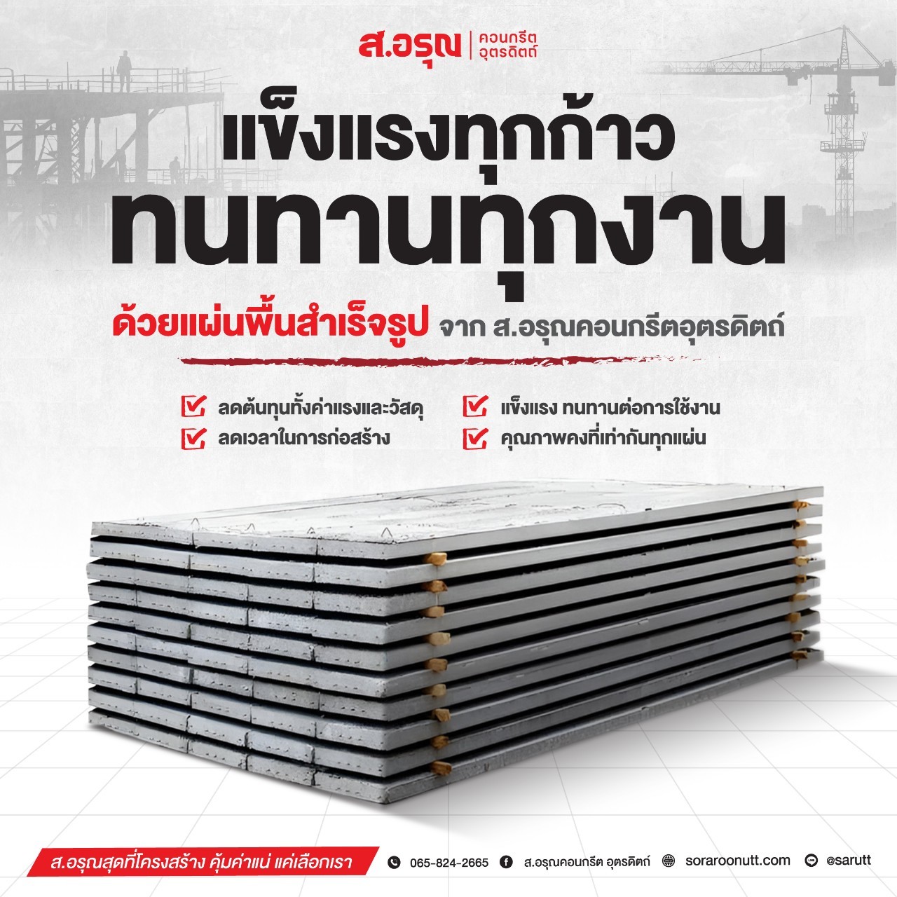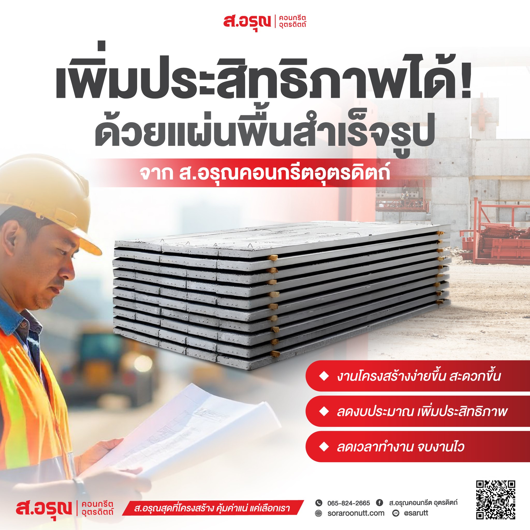 แผ่นพื้นสำเร็จรูปตัวช่วยให้งานก่อสร้างเร็วขึ้น! มองหาวัสดุที่จะช่วยให้งานก่อสร้าง ง่ายขึ้น สะดวกขึ้น และคุ้มค่าขึ้น อยู่ใช่ไหม แผ่นพื้นสำเร็จรูปจาก ส.อรุณคอนกรีตอุตรดิตถ์ คือคำตอบ! ข้อดีของแผ่นพื้นสำเร็จรูป ที่ทำให้ผู้รับเหมานิยมเลือกใช้ ✔ ติดตั้งง่าย ลดขั้นตอนเยอะมากยกวางได้ทันที ไม่ต้องทำแบบ ไม่ต้องผูกเหล็ก ✔ ประหยัดเวลา ไม่ต้องรอเทปูนงานเดินหน้าไว ลดเวลาหน้างาน ประหยัดค่าแรง✔ ลดต้นทุนแรงงานใช้ช่างน้อยลง ลดค่าใช้จ่ายด้านแรงงาน แต่ยังได้คุณภาพงานที่มาตรฐานสูง✔ แข็งแรง ทนทาน มี มอก. รับรองผลิตด้วยคอนกรีตคุณภาพสูง + เหล็กเสริมมาตรฐานทุกแผ่น✔ งานเรียบ สวย มาตรฐานเท่ากันทั้งโครงการช่วยให้งานเสร็จออกมาสวยงามและสม่ำเสมอ เหมาะกับงานบ้าน อาคาร โรงเรียน และงานโครงสร้างทุกประเภท ต้องการงานก่อสร้างที่เร็ว ประหยัด และได้มาตรฐาน เลือกแผ่นพื้นสำเร็จรูปคุณภาพสูงจาก ส.อรุณคอนกรีตอุตรดิตถ์ ตัวช่วยที่ผู้รับเหมาใช้แล้วรู้สึกถึงความต่าง! สอบถามรายละเอียดสินค้า โทรสอบถาม แอด LINE